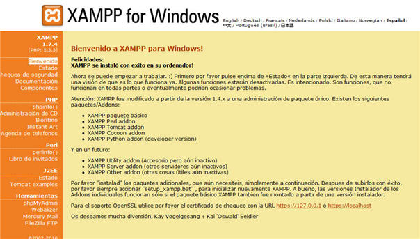 Si todo ha salido bien, se nos permitirá escoger idioma y, posteriormente, encontraremos una pantalla de bienvenida a XAMPP. Aquí hay unas interesantes opciones y varias posibilidades para aprender algo más. Por ejemplo, en el menú izquierdo, se puede hacer un chequeo de seguridad del servidor. Si se hace se observará que la instalación por defecto de Xampp produce “agujeros” de seguridad. Para el resto de esta exposición se asume que, como estamos en un entorno seguro, no vamos hacer ninguna modificación de esa configuración. Si se hicieran modificaciones (si, por ejemplo, a root, el súper usuario de MySQL, se le pusiera contraseña) la posterior configuración de Claroline u otras aplicaciones variaría paralelamente.